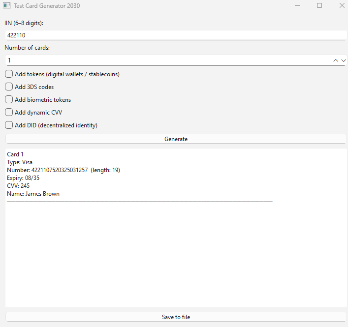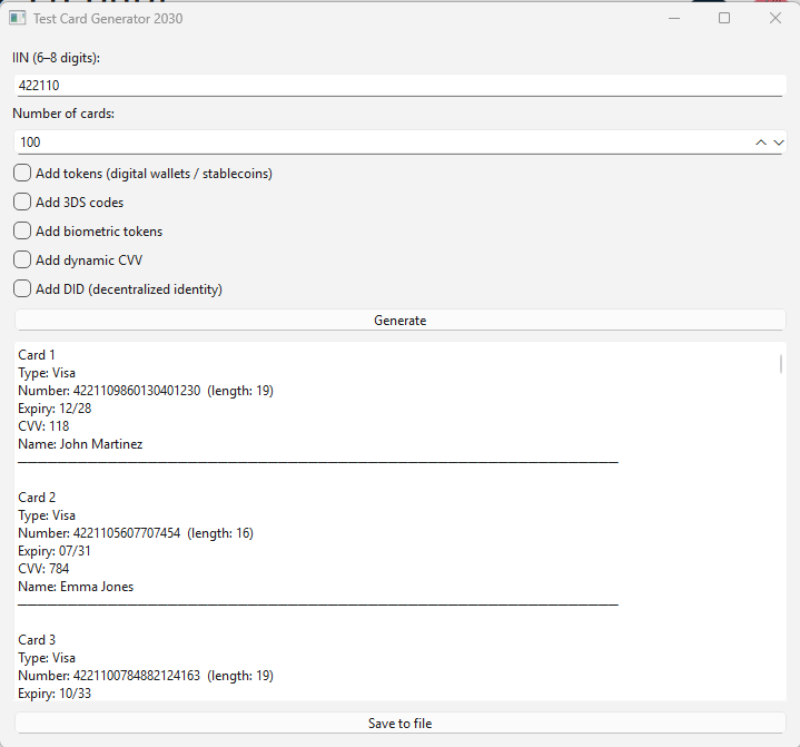 Generate Luhn-valid test cards with tokens, 3DS codes, biometrics, and DIDs — all from a desktop app you can run offline.
