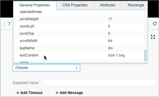 TestCafe Studio will generate a selector for this element and open the list of its properties. Select the property you wish to assert.