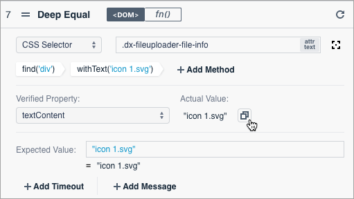 TestCafe Studio retrieves the current property value and you can confirm you want to use it for comparison.