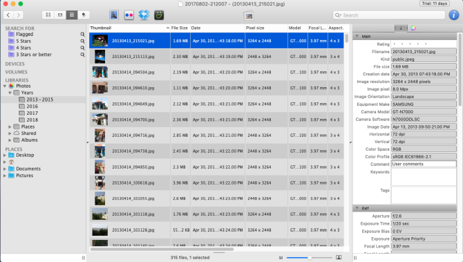 When you launch the app, you’ll see three panels. To the left, you’ll see the entire folder structure, any smart folders you create, and devices you’ve connected. The viewer shows the contents of the selected folder, with different view options. Icon view shows the thumbnail view of images, and List view shows a small thumbnail with the image metadata. At the right, you’ll see the Inspector panel.