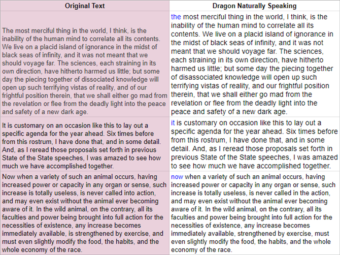 Dragon scored 100% on accuracy on all three sample texts. While it failed to capitalize the first letter on every text, it otherwise performed beyond my expectations.