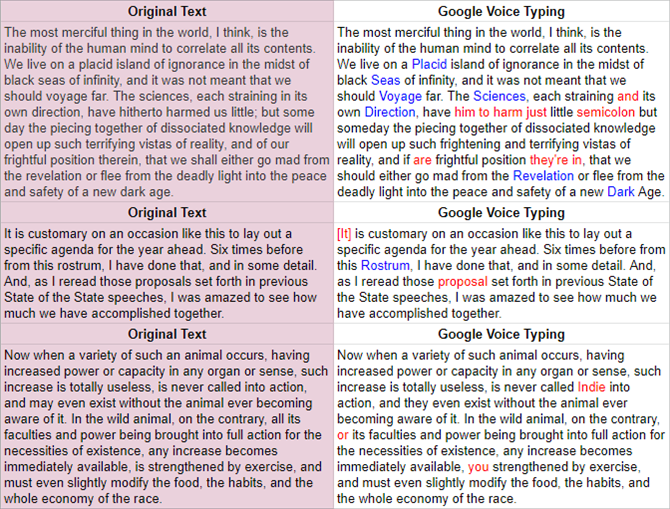 When a speech-to-text software miscapitalized a word, I marked the text as blue in the right-column (see graphic below). When one of the software got a word wrong, the misspelled word was marked in red. I did not consider wrong capitalizations to be errors.