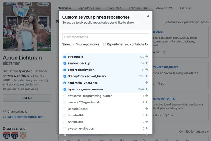 GitHub also allows you to pin your favorite or most relevant repositories to your profile page. Users with a free account can pin up to six repositories that will remain on the top of their profile.