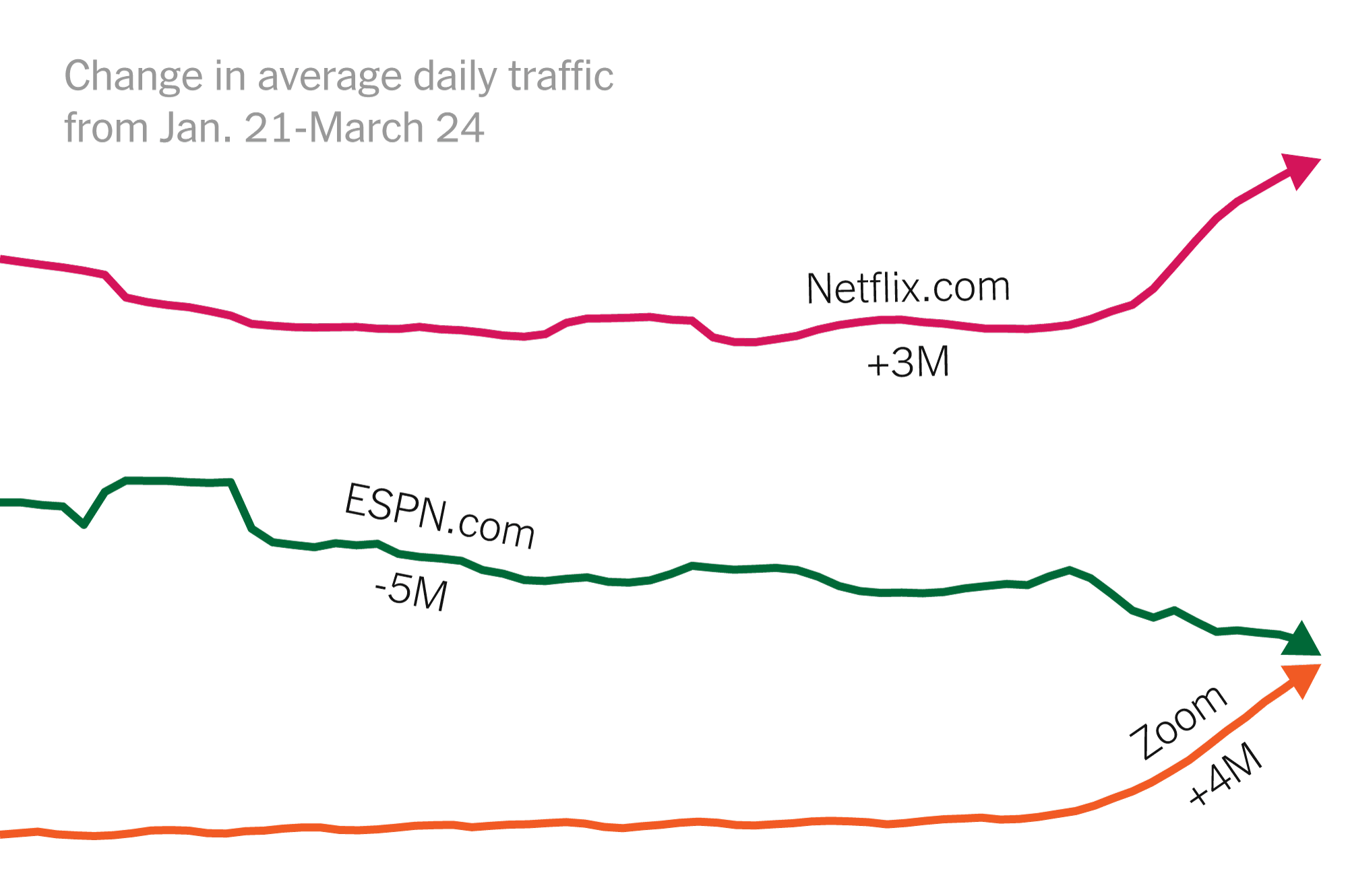 A New York Times analysis of internet usage in the United States from SimilarWeb and Apptopia, two online data providers, reveals that our behaviors shifted, sometimes starkly, as the virus spread and pushed us to our devices for work, play and connecting. From the report: