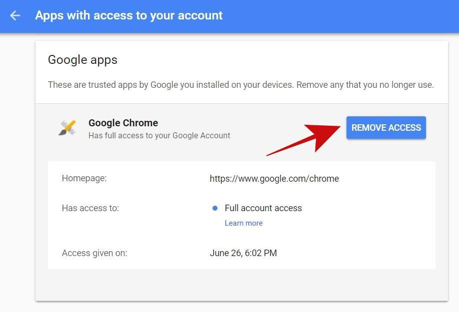 - Now you will see the list of apps connected to your account, i.e., apps that can access your account info based on their approved permissions. You can click on an app to view its details including its access permissions and the approval date and then click “REMOVE ACCESS” to revoke the app. I will suggest revoking all suspicious, unauthorized, and unused apps.