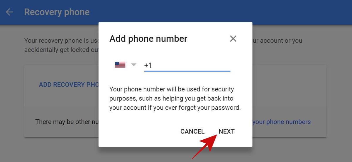 Click on “Recovery phone”, then click on “ADD RECOVERY PHONE“, then type in the phone number you wish to add as the recovery phone and click NEXT. Google will ask you to confirm your number, so verify it, and it will get added. If you wish to edit it, click the pencil icon and change the recovery phone.