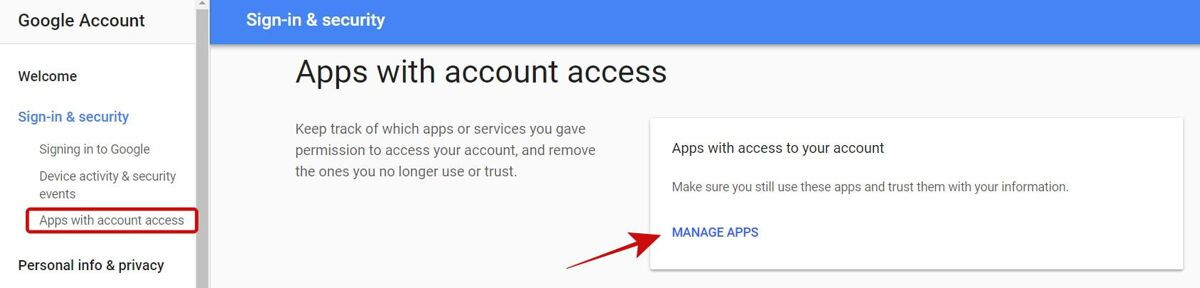 - Click “Apps with account access” on the left, then click “MANAGE APPS“.