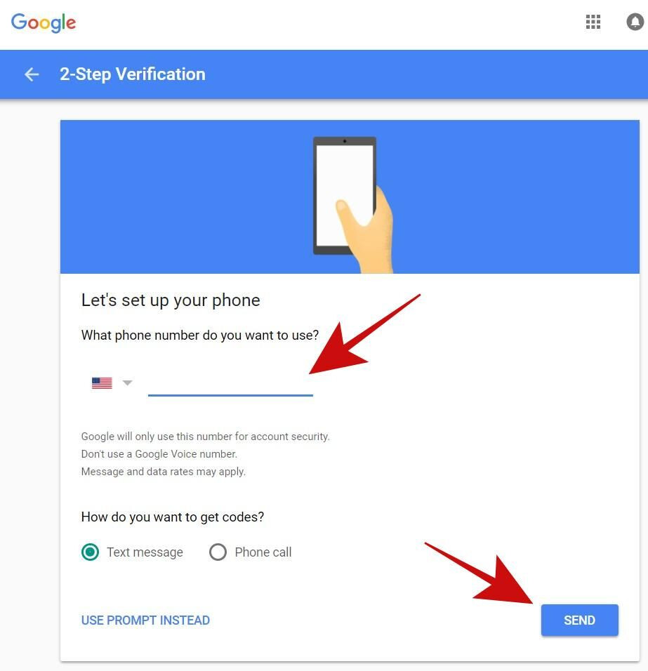 - If you clicked “DON’T USE PROMPT” in the last step and wish to set up your phone number as the two-step verification, then enter your phone number and press SEND. Google will send a verification code on your phone number. Enter it if asked, and you are done setting it up.