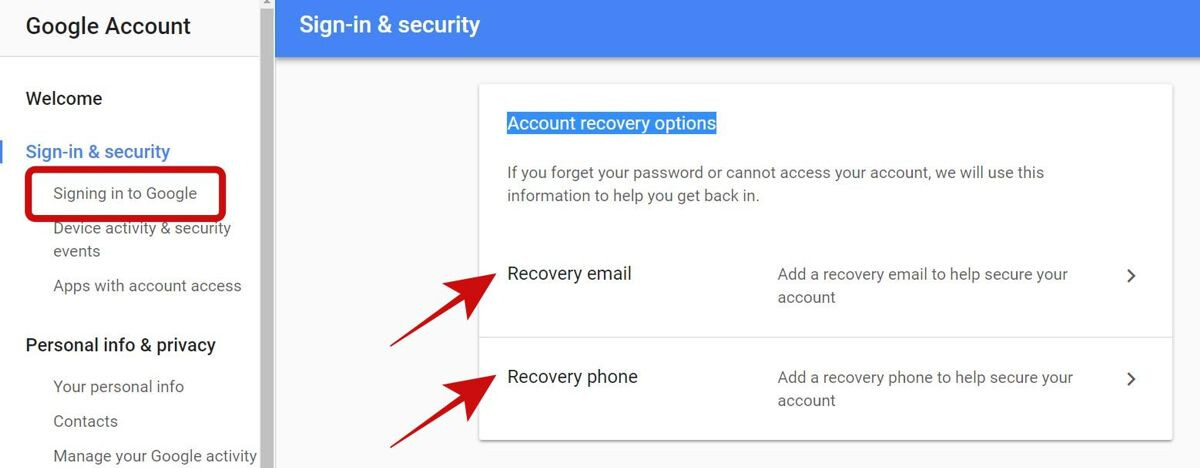 - Click “Signing in to Google” in the left sidebar, and scroll down to the section named “Account recovery options“.