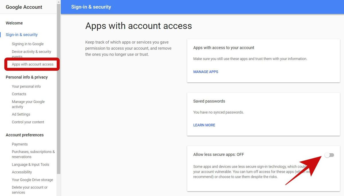 - Click “Apps with account access” in the left sidebar, and toggle off the button whose name starts with “Allow less secure apps”.