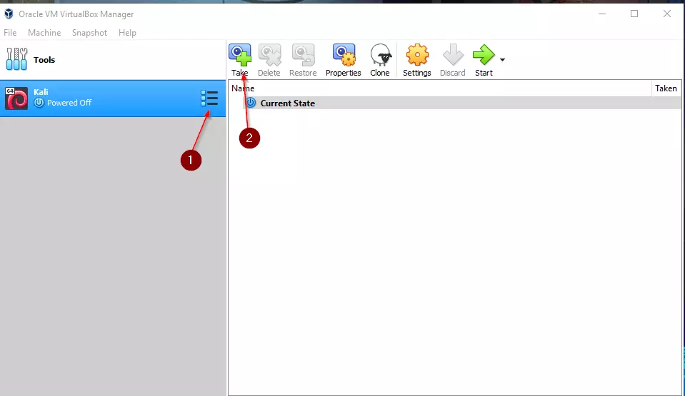 To take a Snapshot in VirtualBox 6.0, select your Kali VM , click on the dropdown icon next to it and select Snapshots . Click on the take icon to create a new Snapshot. Name it properly.