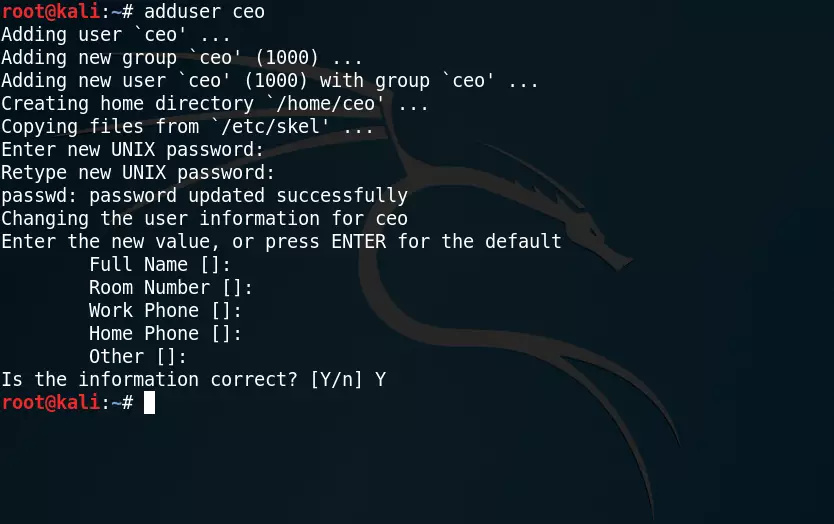 Now we need to add our new user to the Sudo’ers group. If you want to use Kali Linux, you should be familiar with this command. I highly recommend getting your Linux Basics straight before starting to use Kali at all. By adding the user to the sudo group, or, as originally referred to as “superuser do” group, you are allowed to run commands that require root by putting the “sudo” command in front of it. For example, the apt-get upgrade command we ran above wouldn’t be allowed for our new user. Although, if you put “sudo apt-get upgrade” in front of it, it will ask you for your sudo password and run the command for you.