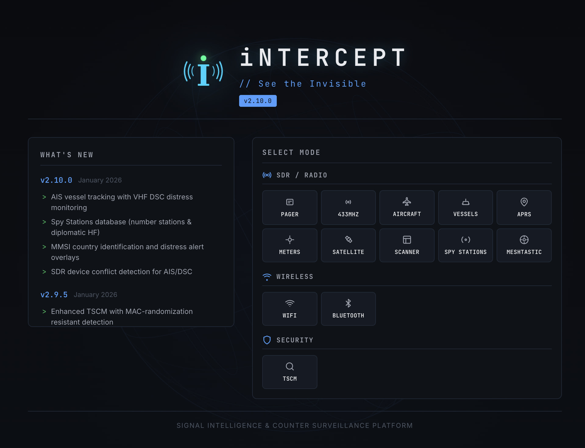 iNTERCEPT is a free, open-source platform that lets you see all of it. Think of it as a dashboard for the invisible world β plug in a $25 USB radio dongle, open a browser, and suddenly you can hear what the airwaves are saying. No radio license needed. No hacking. These signals are being broadcast openly β this tool just lets you listen.