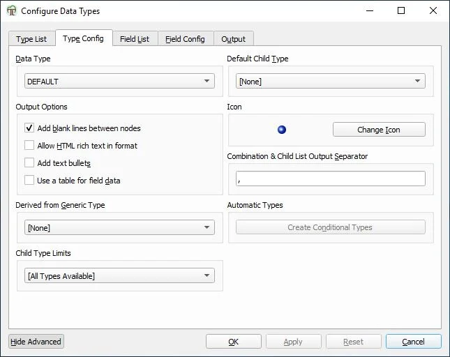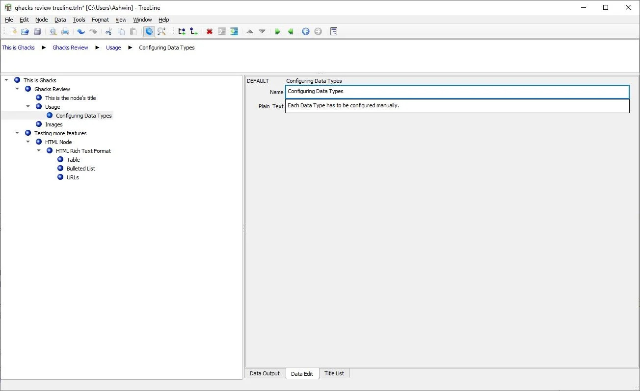 Click on the Data menu, and select “Configure Data Types” option. There are 5 tabs here. The first tab is Type List, you can set various data types here (plain text, html, etc). TreeLine always has a “DEFAULT” type, we’ll use it in this example.