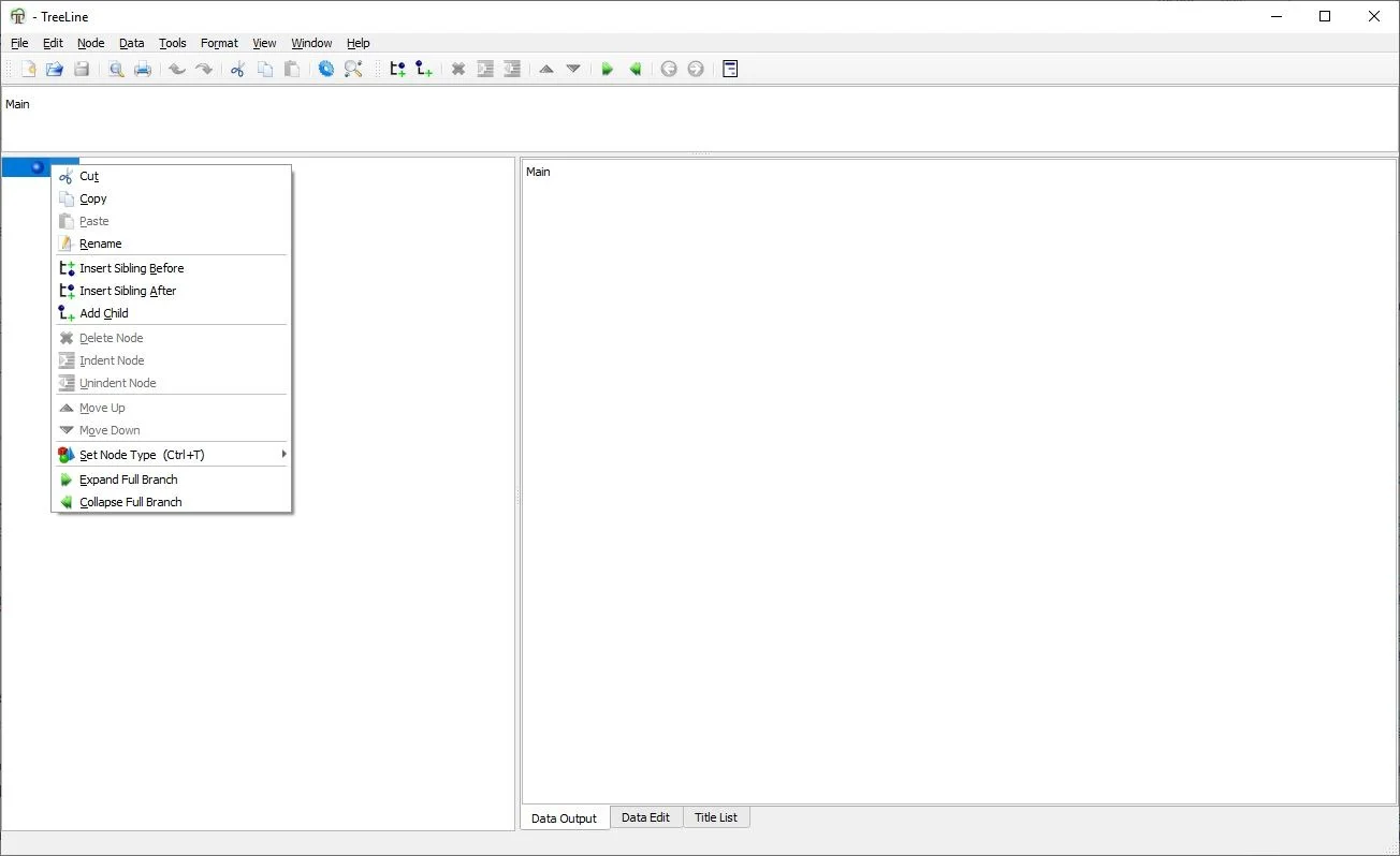 TreeLine’s true strength lies in data types. These are values that you’ll have to manually configure. The default notebook starts blank, as in it has no entries. Right-click on the word “Main” in the Tree View (left side-bar) to view the context menu.