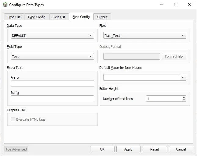 Click on the “New Field” button on the right. Since we want to store text content, we’ll name it as “Plain_Text”. The program always sets the type of new fields to Text, if you want to change this, use the “Field Config” tab. For now though, let’s leave it be.