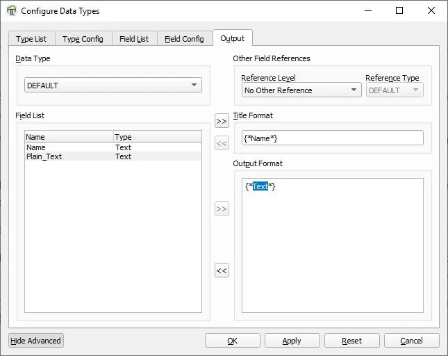 Go to the Output tab, and set the output format to {Plain_Text}. The Title format has the value {Name}, which can be left unmodified.