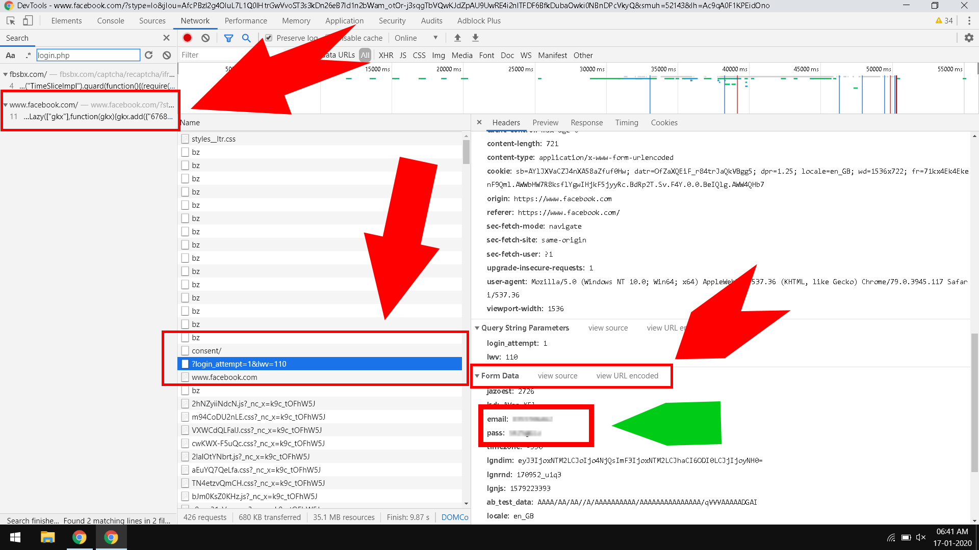 - Once you click on it, in the right window pane, you will see four tabs namely Headers, Preview, Response, Cookies and Timing . Give a click on Headers tab. Scroll all the way down, till you find the section named Form Data . Scroll down again to find two entries named email and pass . Well, that’s it. You can see the recently logged email account and password, in pure plain text, just like that.