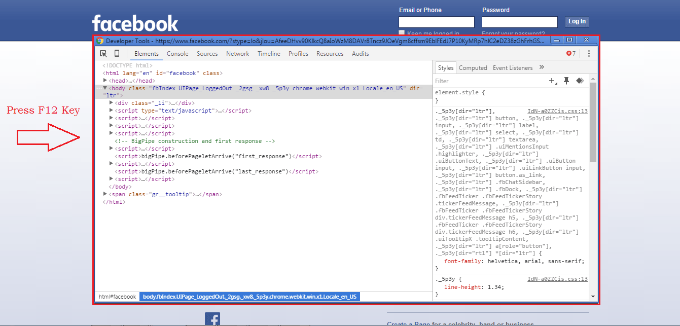 - Before letting your friend use your system to log into his/her facebbok account, you have works to do. No, nothing big, just a couple of clicks. You just have to press the F12 key on your keyboard. This will launch the Developer tools window as shown in the below screenshot.