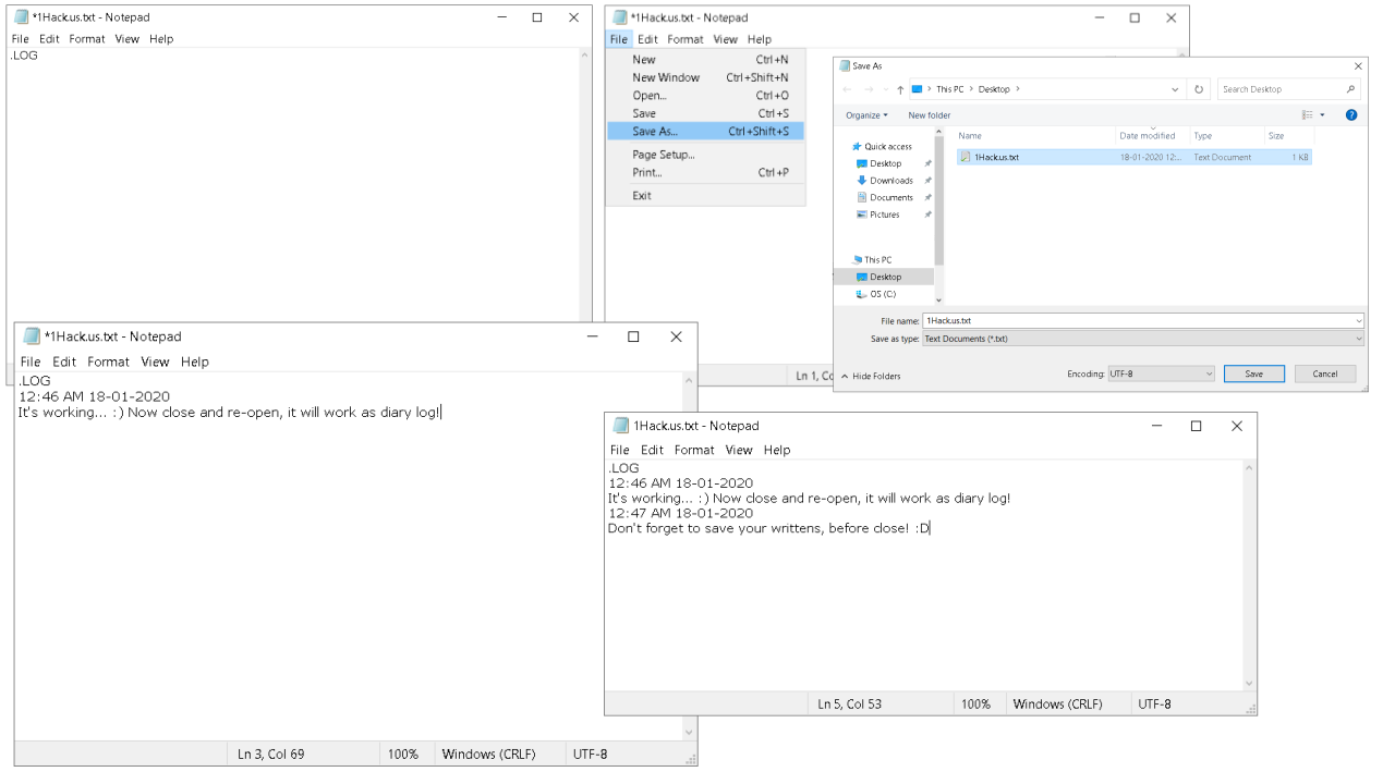 You can use this trick to create a personal log with Notepad which will automatically include the current date and time before your note. To do so, open Notepad and type .LOG in capital letters and press Enter. Save the file. Now, every time you open this file, notepad will automatically insert the current time and date before the note. Just enter your note and save the file each time after making an entry.