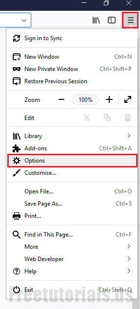 - Open up Mozilla Firefox, Click on Menu (3 Horizontal Lines) & Then click on “Options”