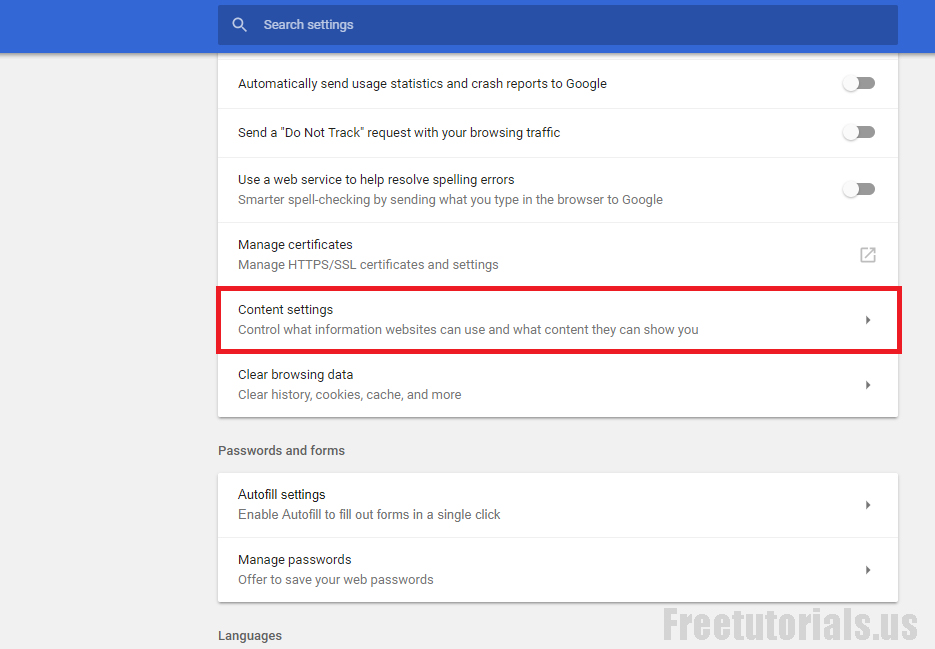 - Scroll down until you find out “Content Settings” (Above “Clear browsing data”) & click on it.