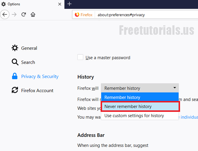 - Once you’re on the page, click on “Privacy” from left sidebar. Then click on Dropdown menu under “History” & choose “Firefox will Never Remember History”