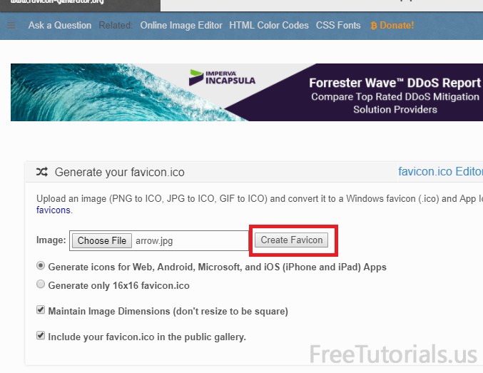 - Now, once image is opened, click on “Create Favicon” button & wait for it to process the image.
