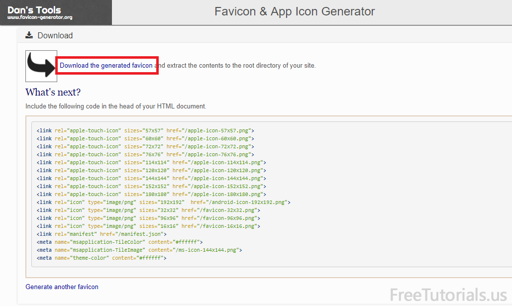 - Once image is processed, a new page will be opened. Click on “Download The Generated Favicon” link & it should start downloading the archive.