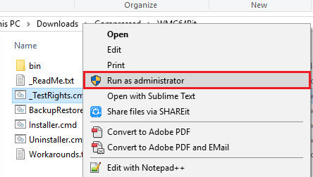 - Once extracted, right click on “_TestRights.cmd” file & click “Run as administrator” & wait for the command prompt window to close.