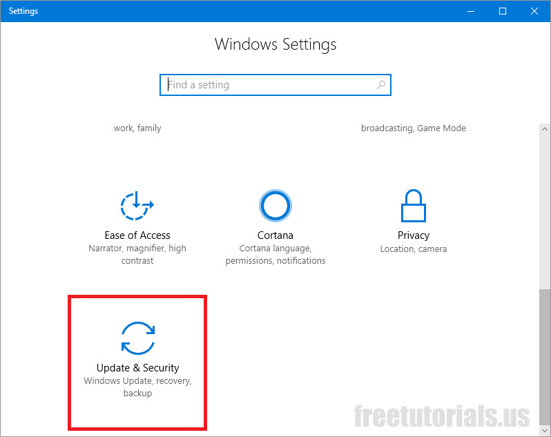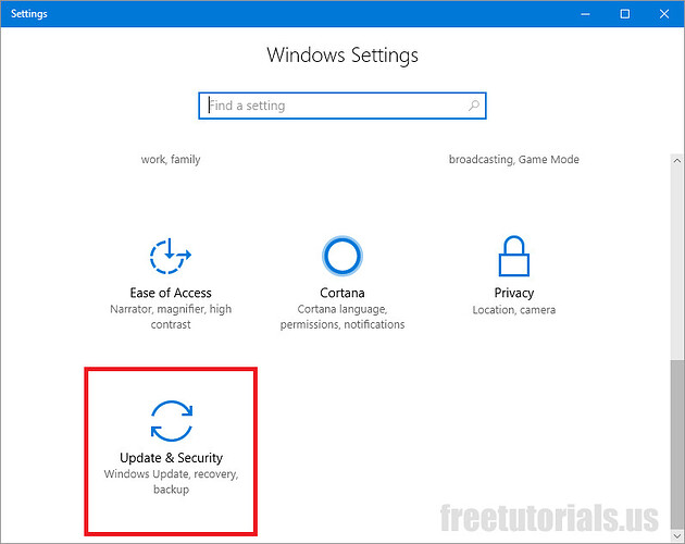 - Once you’re in windows settings, scroll down & click on “Updates & Security”