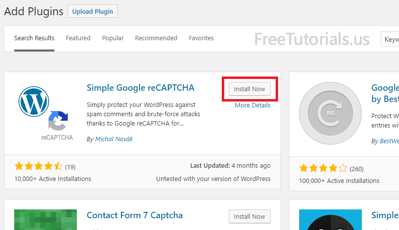 - Once you’re on the page, type “Simple Google reCAPTCHA” (without quotes) in the search bar & hit enter from keyboard. Once plugin appears, click on Install button & wait for it to be installed.