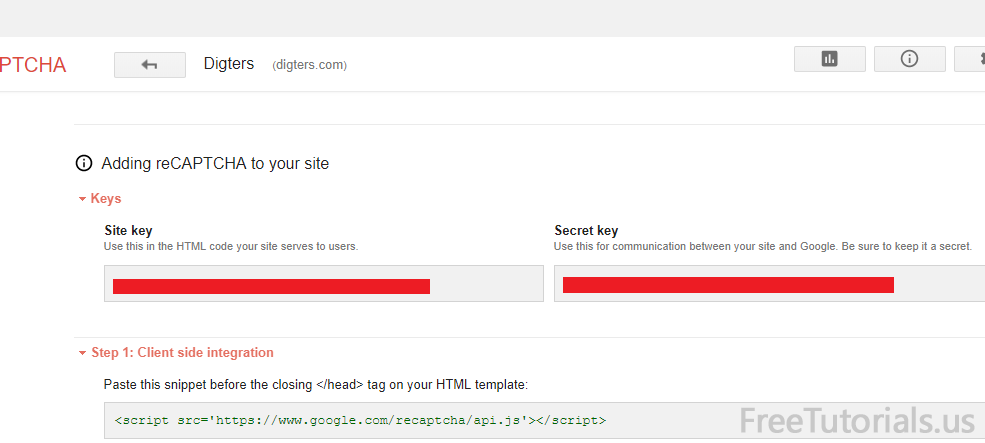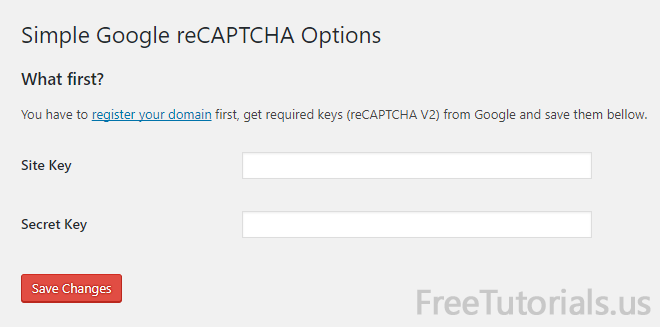 - Another page will be opened, where it will give you site key & secret key. Copy these keys & paste them in the plugin’s page, then click “Save Changes” button.