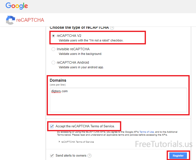 - Next, select “reCAPTCHA V2” & type in website URL in the textbox, check the terms & click register.