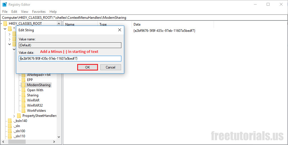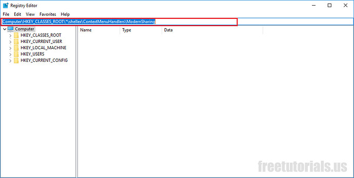 - In Windows registry editor, in address bar, type “HKEY_CLASSES_ROOT*\shellex\ContextMenuHandlers\ModernSharing” & hit enter. (If adress bar isn’t present, click on “View–>Address bar” to get it.)