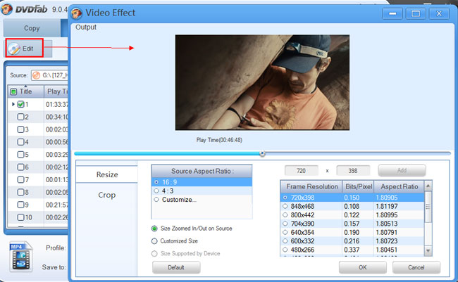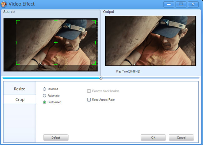 • After parameters settings, if you want to resize or crop the video, just click Edit button to open Video Effect window. You can resize the source aspect ratio and the frame resolution; and you can also crop the image for display right here.