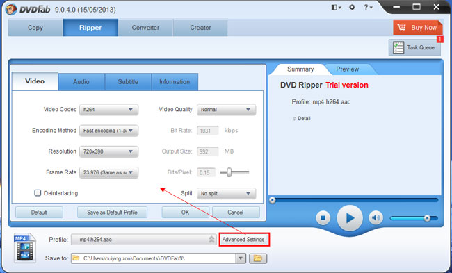 After the MP4 profile is selected, let’s click Advanced Settings button to set video and audio parameters as you like, or just leave them there since the default configuration work well if you have no specific requirements.