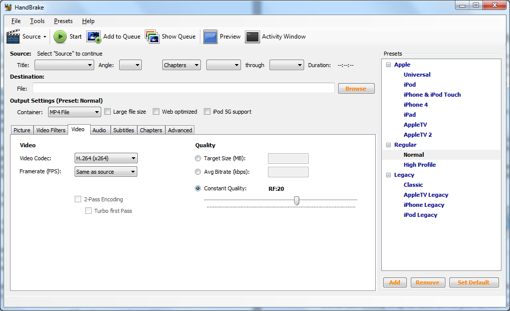 • Next, look at HandBrake’s preset menu on the right side. It has a list of preset outputs for a slew of Apple devices (which tend to be finicky about the kinds of movie files they’ll play). If you don’t intend to use any of the game consoles or iOS devices included in the presets, you can manually arrange your own settings by choosing Normal or High Profile.
