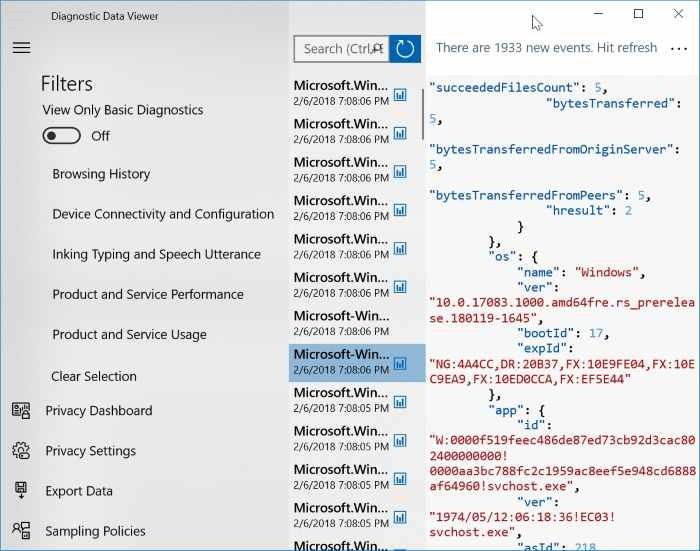 As said earlier, the Diagnostics Data Viewer is designed to help users view the diagnostics data your Windows 10 device is sending to Microsoft.