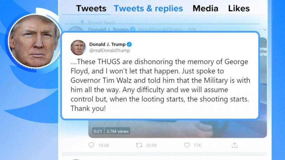 This is the first time such a step has been taken against a head of state for breaking Twitter’s rules about glorifying violence, a company spokesman said. The company said users’ ability to interact with the tweet will be limited, and that users can retweet it with comment, but not like, reply to, or otherwise retweet it. “…These THUGS are dishonoring the memory of George Floyd, and I won’t let that happen. Just spoke to Governor Tim Walz and told him that the Military is with him all the way. Any difficulty and we will assume control but, when the looting starts, the shooting starts. Thank you!,” Mr. Trump’s tweet said.