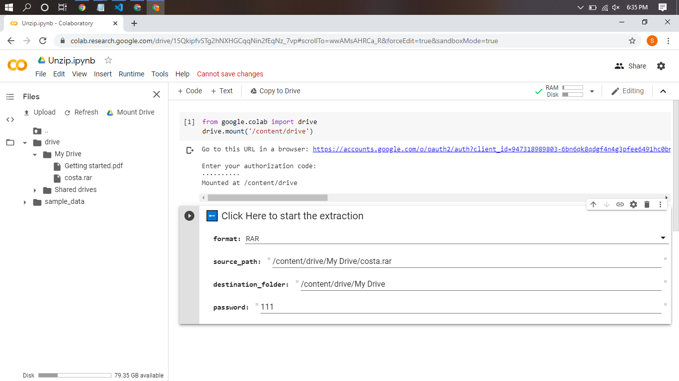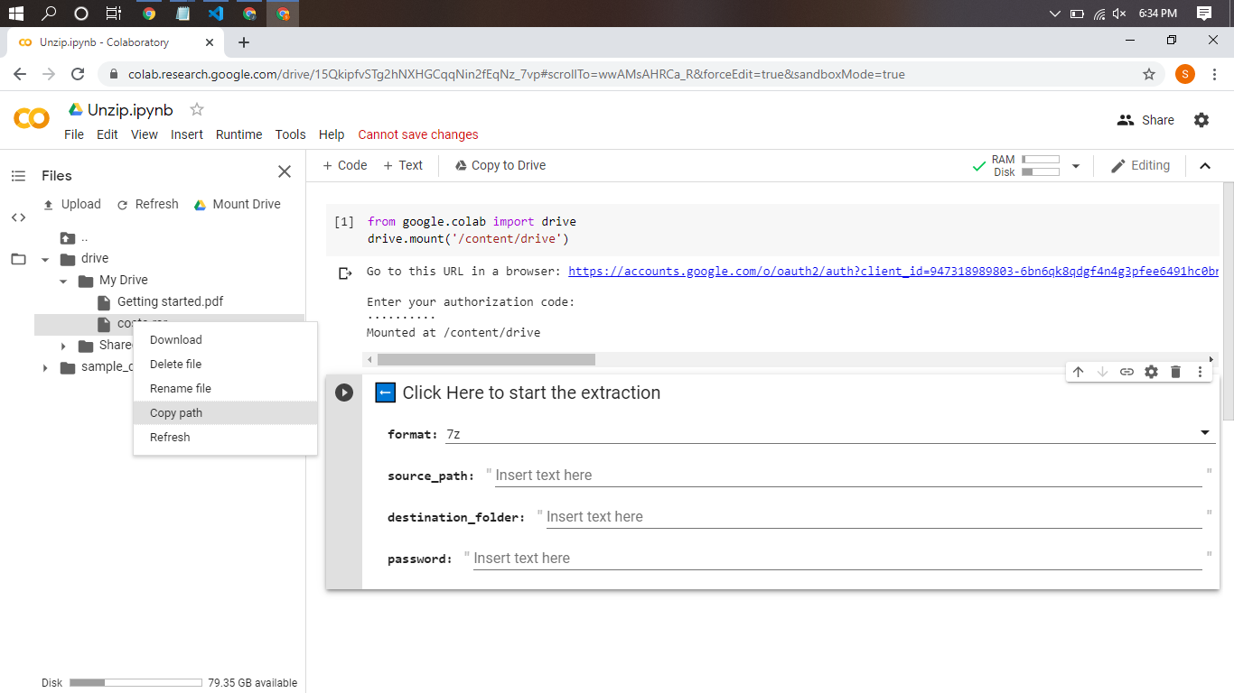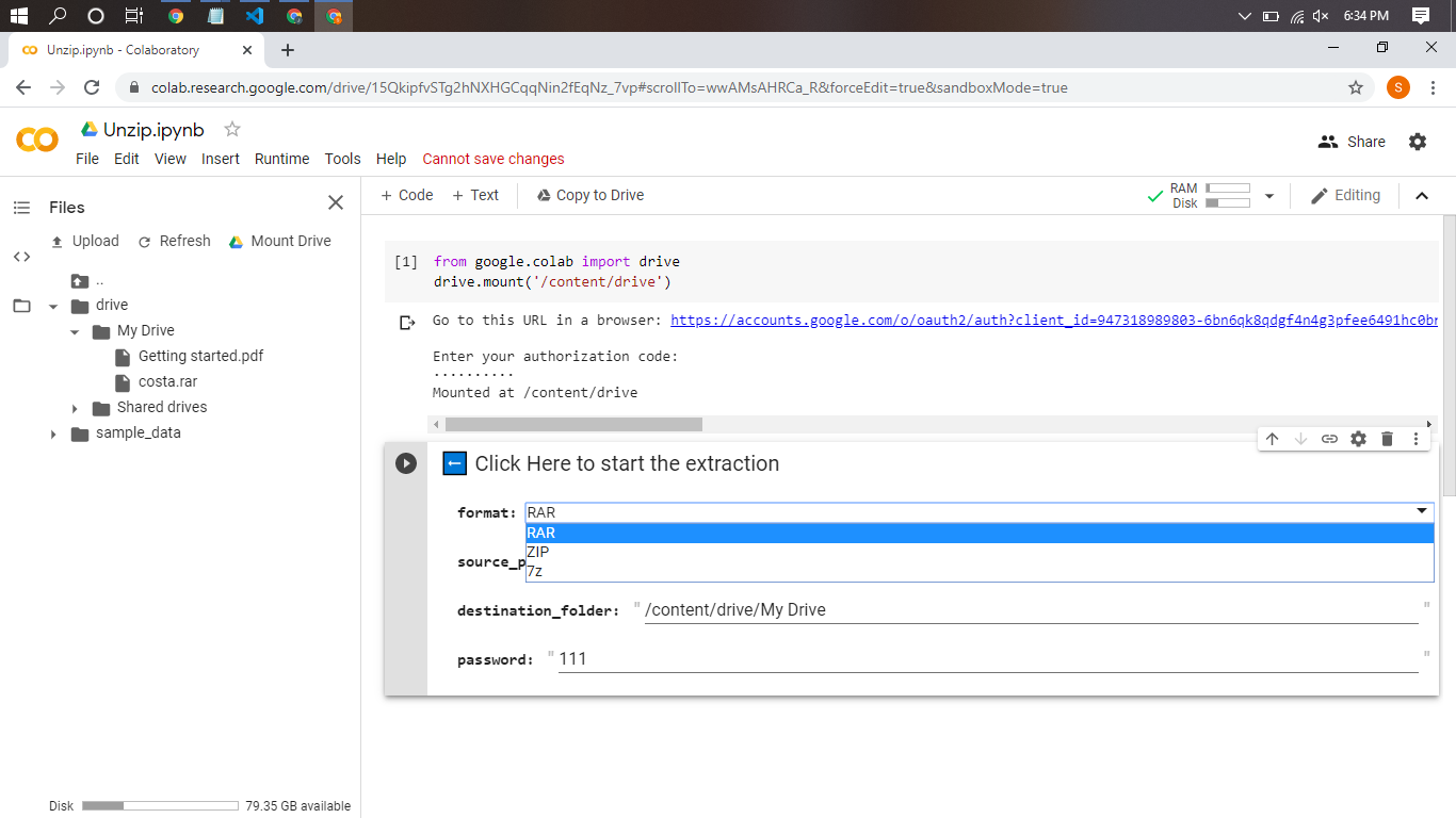 Execute that script and you will get the link to auth your account. Click the link, select your account that you want to use as a google drive storage. Allow the permission and you will get the code to auth your Gdrive. Copy the code, back to your Notebook, paste the code in the box under the sentence ‘Enter your authorization code:’, then click enter.