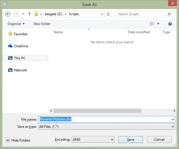 Step 4 : Go to File > Save As and name the file anything you like, but be sure to change the “Save as type” option to All Files (*) and append .vbs to the end of the file name.