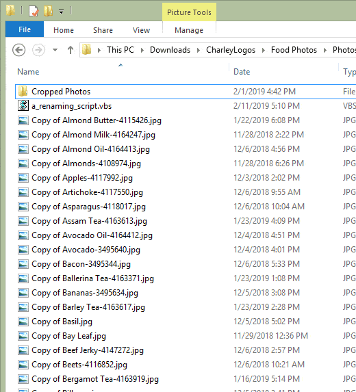 As an example, consider a case like in the example image above where you have a folder of hundreds of images each named Copy of and then a word or two, like Copy of Black Tea.jpg .