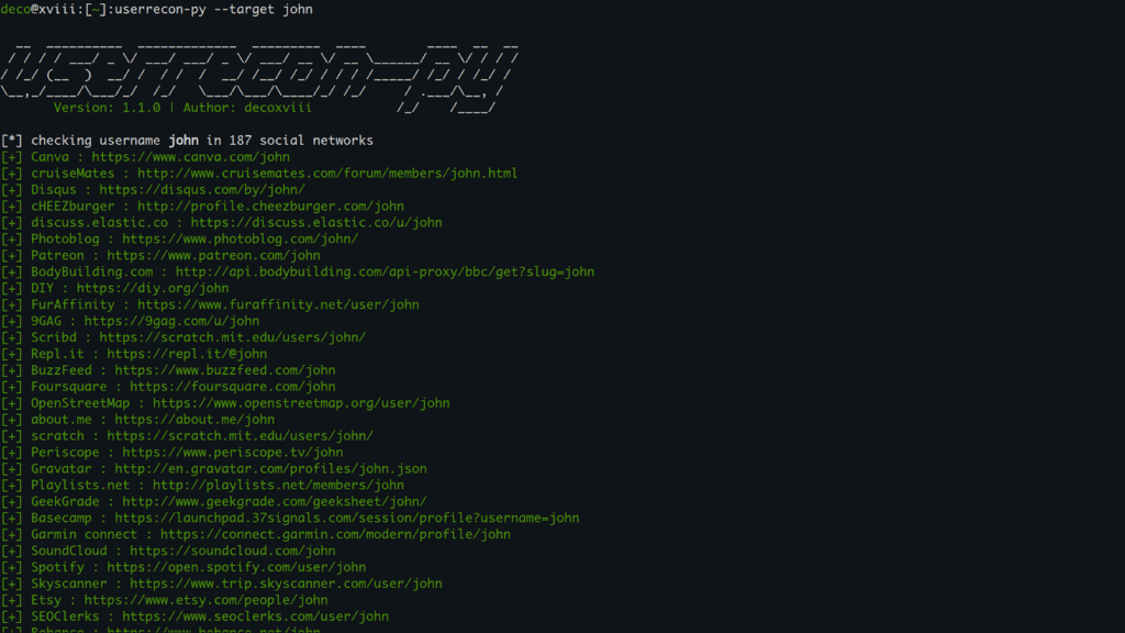 To completely perform reconnaissance to someone, you have to find digital data about target on any websites or social media. Because the data found in any website is very important to deduce correctly who this person really is. You can use any OSINT tools to perform reconnaissance, but you have to try tool called “ userrecon-py ” to perform username Recognition on any Websites and Social networks.