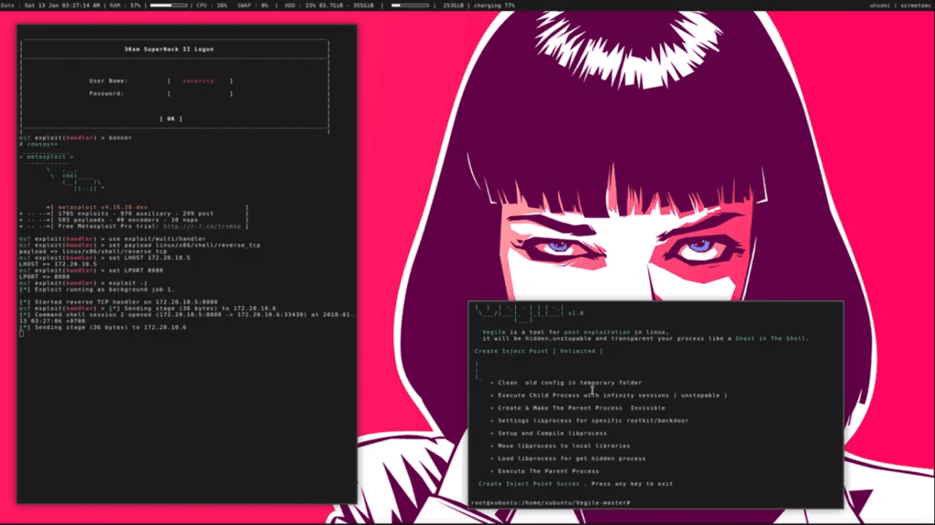 This tool will set up your backdoor/rootkits when backdoor is already setup it will be hidden your specific process, unlimited your session in metasploit and transparent . Even when it is killed , it will re-run again . There will always be a procces which will run another process, so we can assume that this procces is unstopable like a Ghost in The Shell .