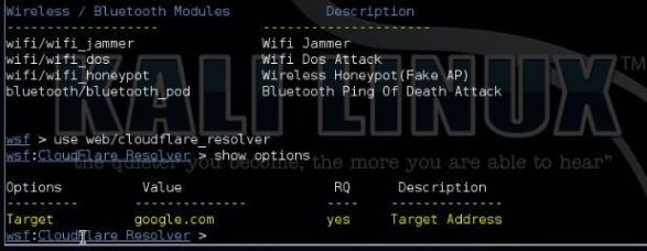 Type the next command to point out the out there choices for the Websploit Cloudflare Resolver module: