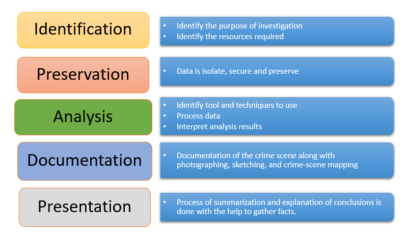 - Process of Digital forensics includes 1) Identification, 2) Preservation, 3) Analysis, 4) Documentation and, 5) Presentation