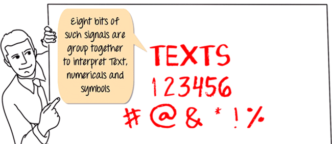 Eight bits of such signals are group together to interpret Text, numerical and symbols.