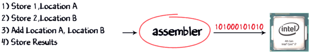 With the advancement in technology i/o devices were invented, you could directly type your program into the PC using a program called ASSEMBLER. It converts it into corresponding machine code (110001..) and feeds to your processor. So coming back to our example addition of (1+2), the assembler will convert this code into machine code and give the output.
