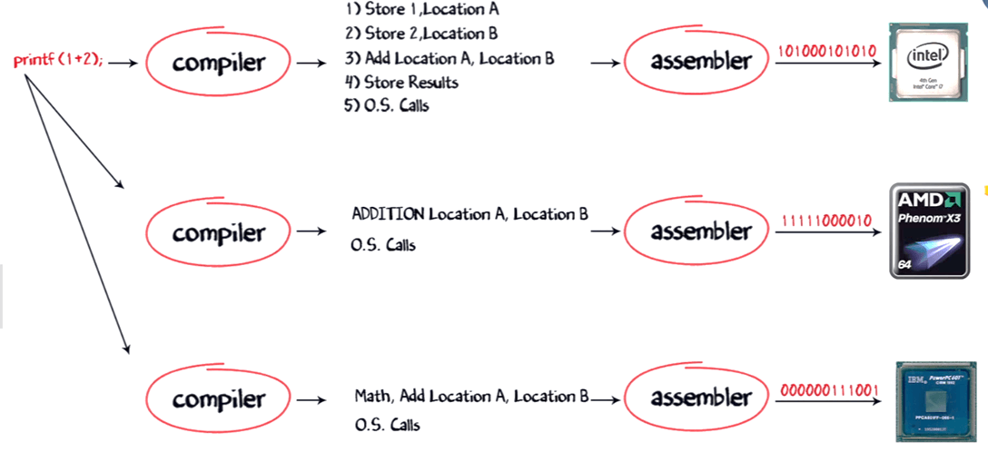 As a developer, I want my software program to work on all platforms available, to maximize my revenues. So I would have to buy separate compilers which convert my print f command into the native machine code.